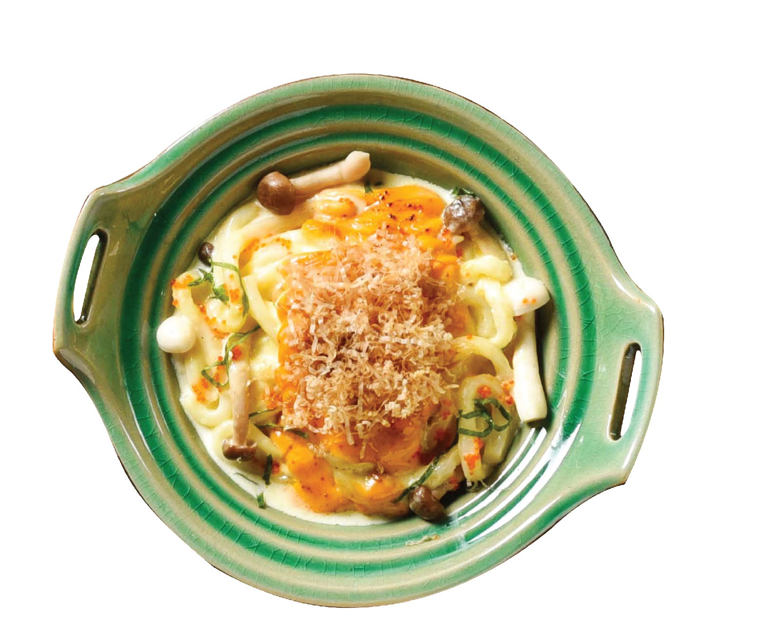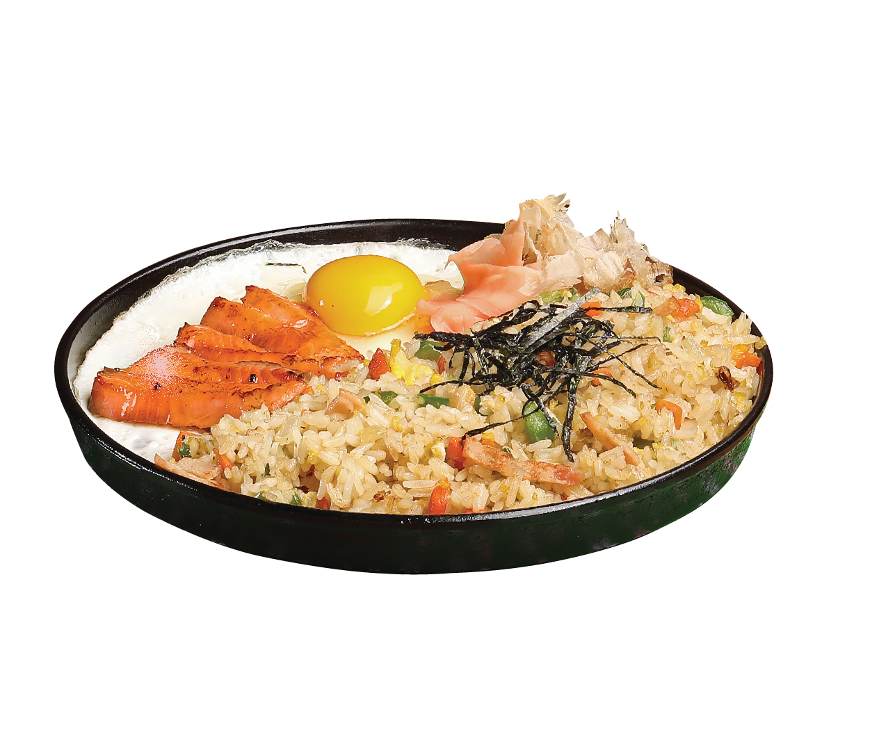Japanese fried rice, mixed of meat and veggies, Served with Katsuobushi and Nori on top.