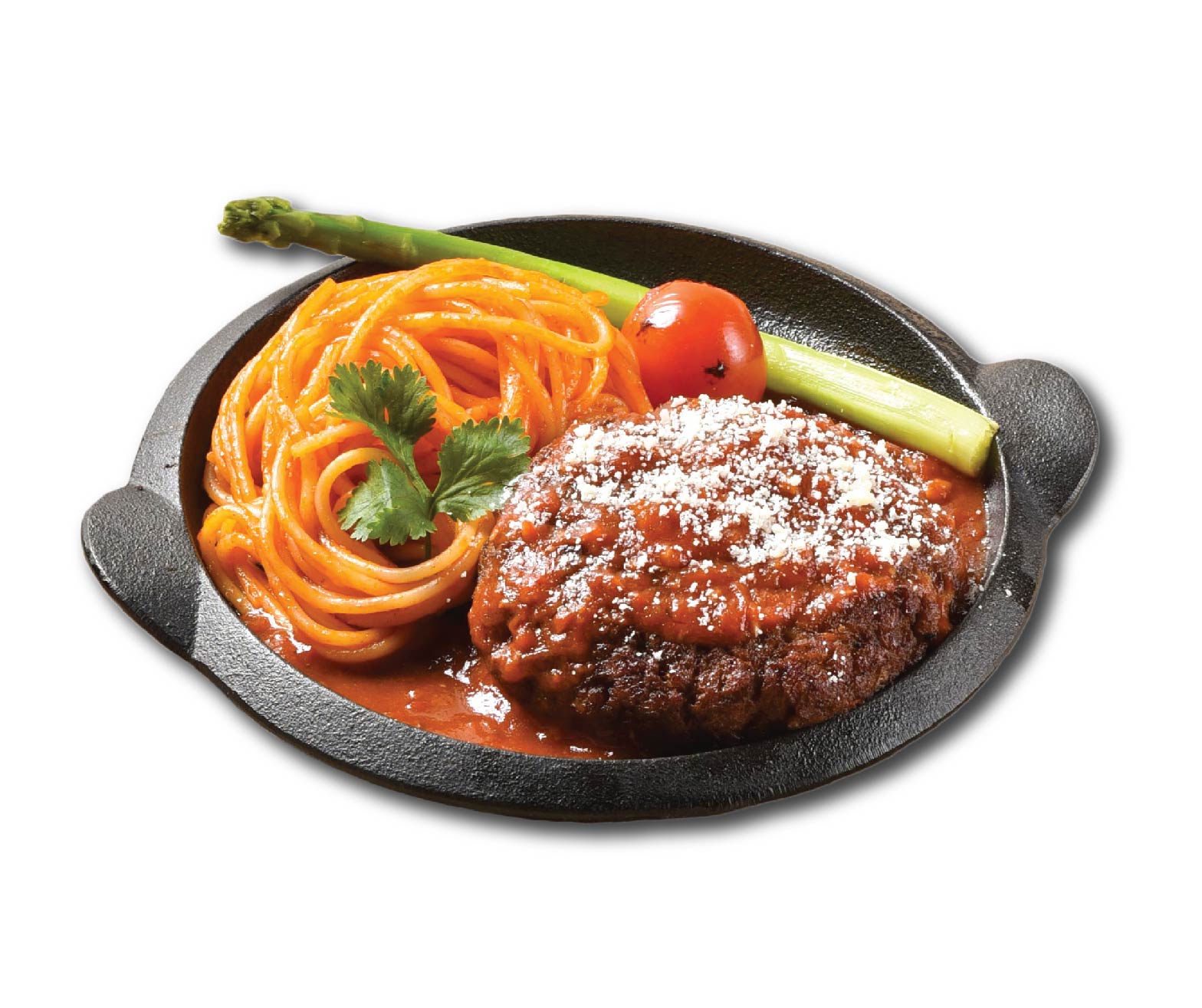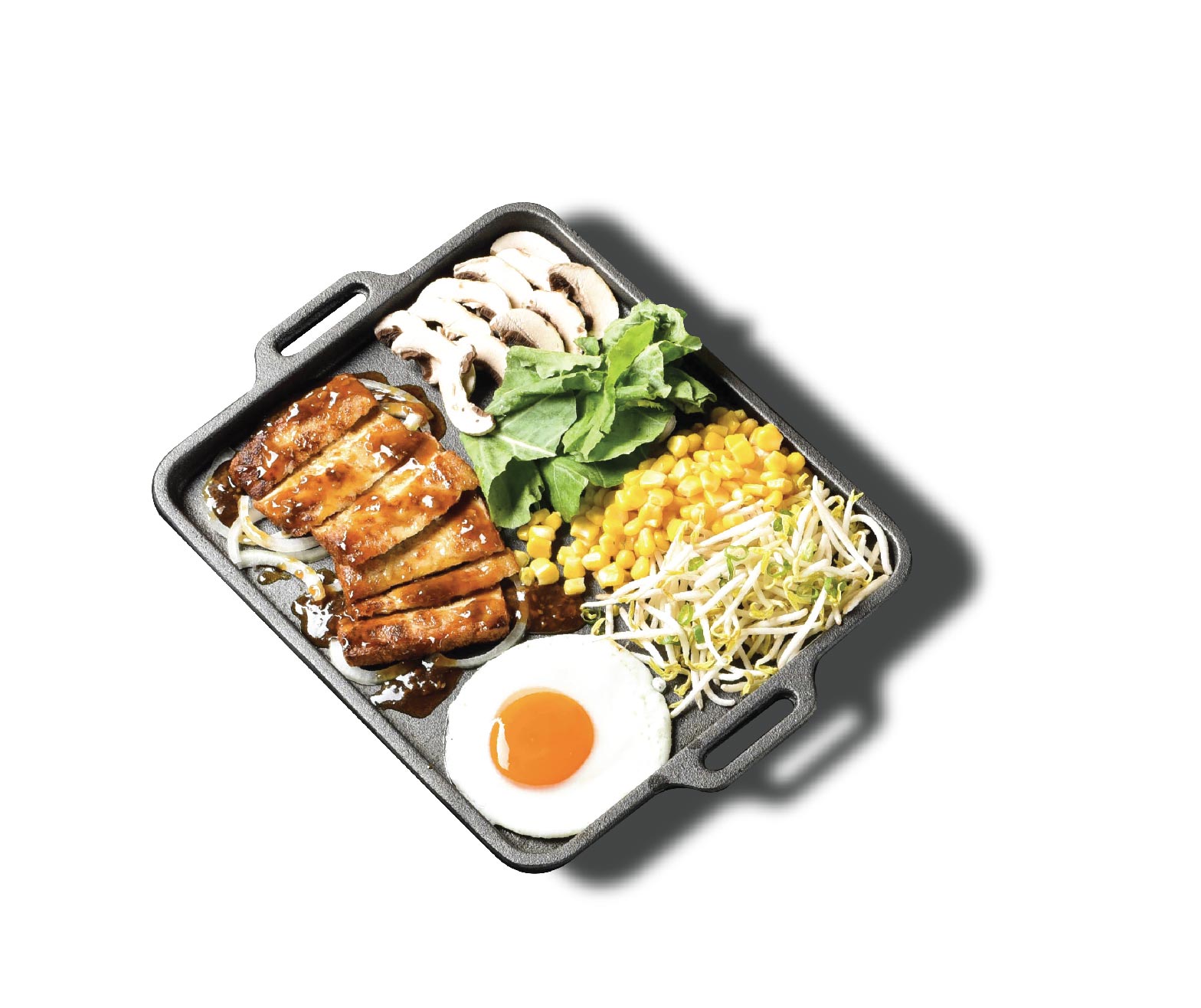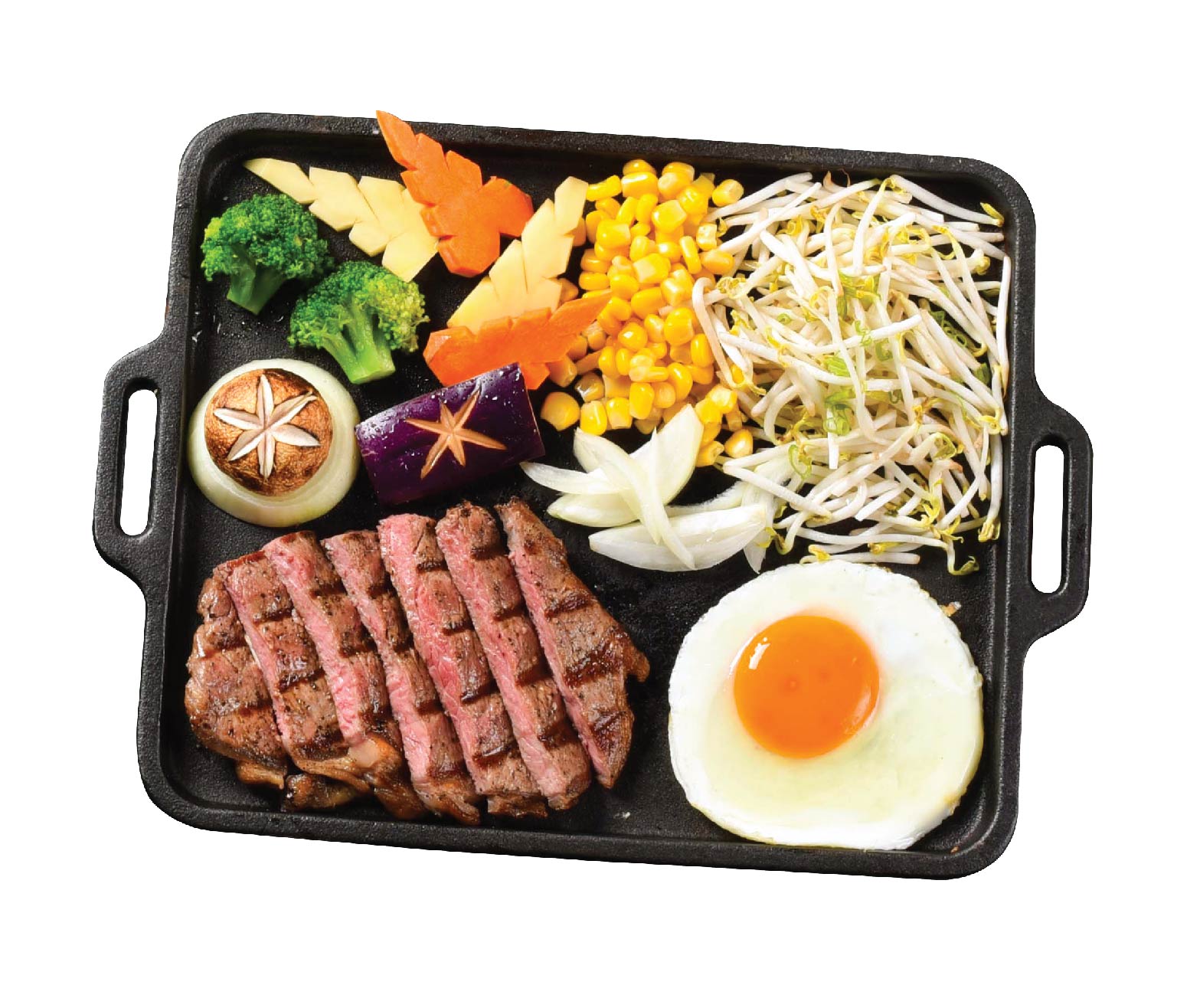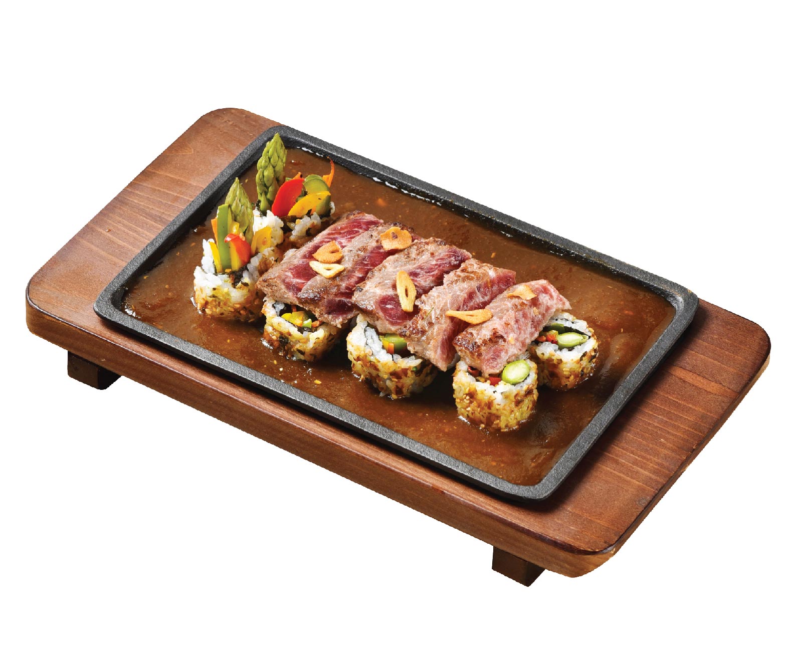 Grilled food on a thick plate enriched by an artful cooking performance. Choose your choice of sauce Gomatare or Black Pepper.