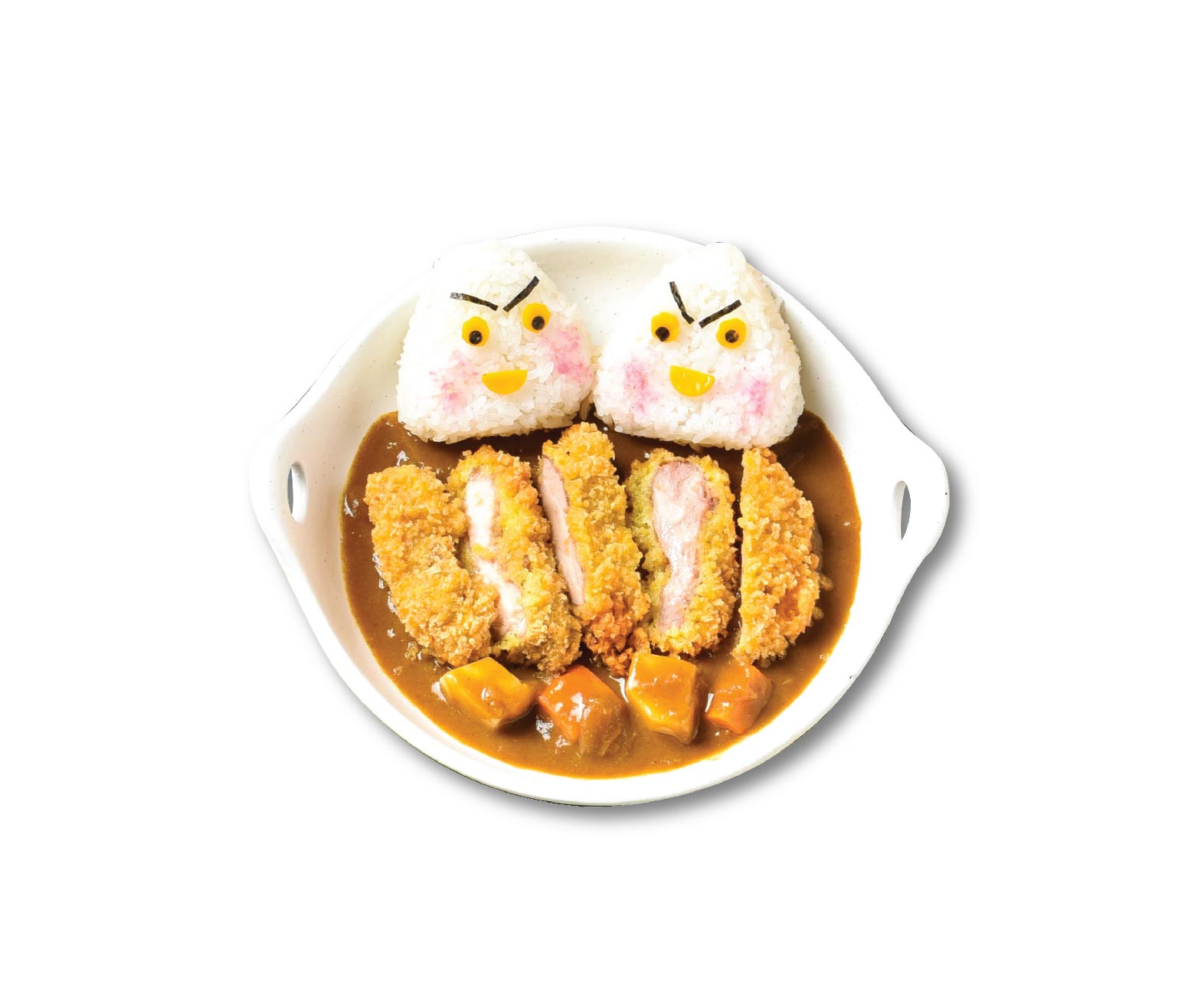 A contemporary japanese dish consisting of an omelette made with seasoned fried rice complimentary with a choice of katsu and curry rice.