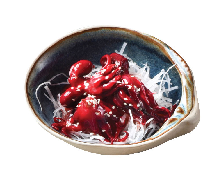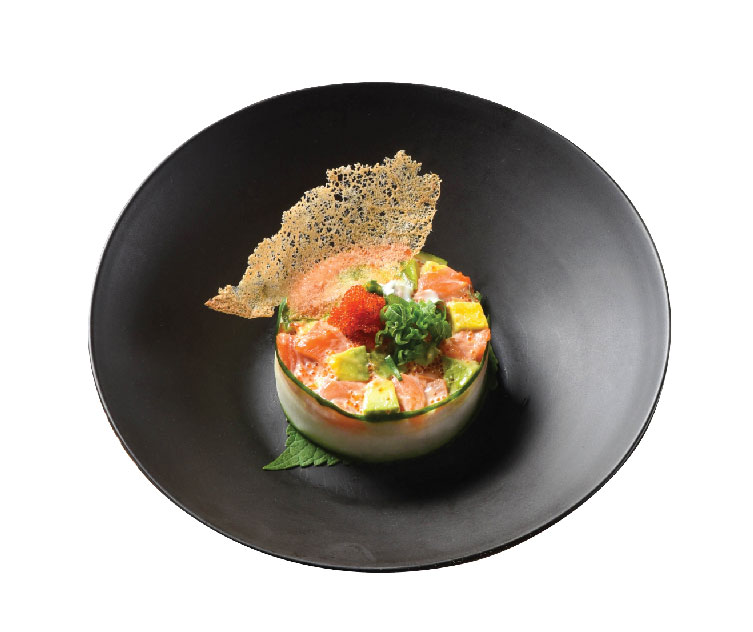 A Japanese dish of bite sized pieces of raw fish eaten with soy sauce and wasabi paste.