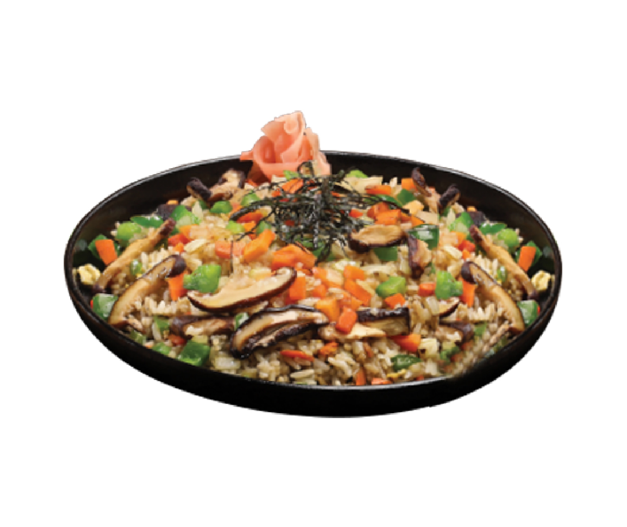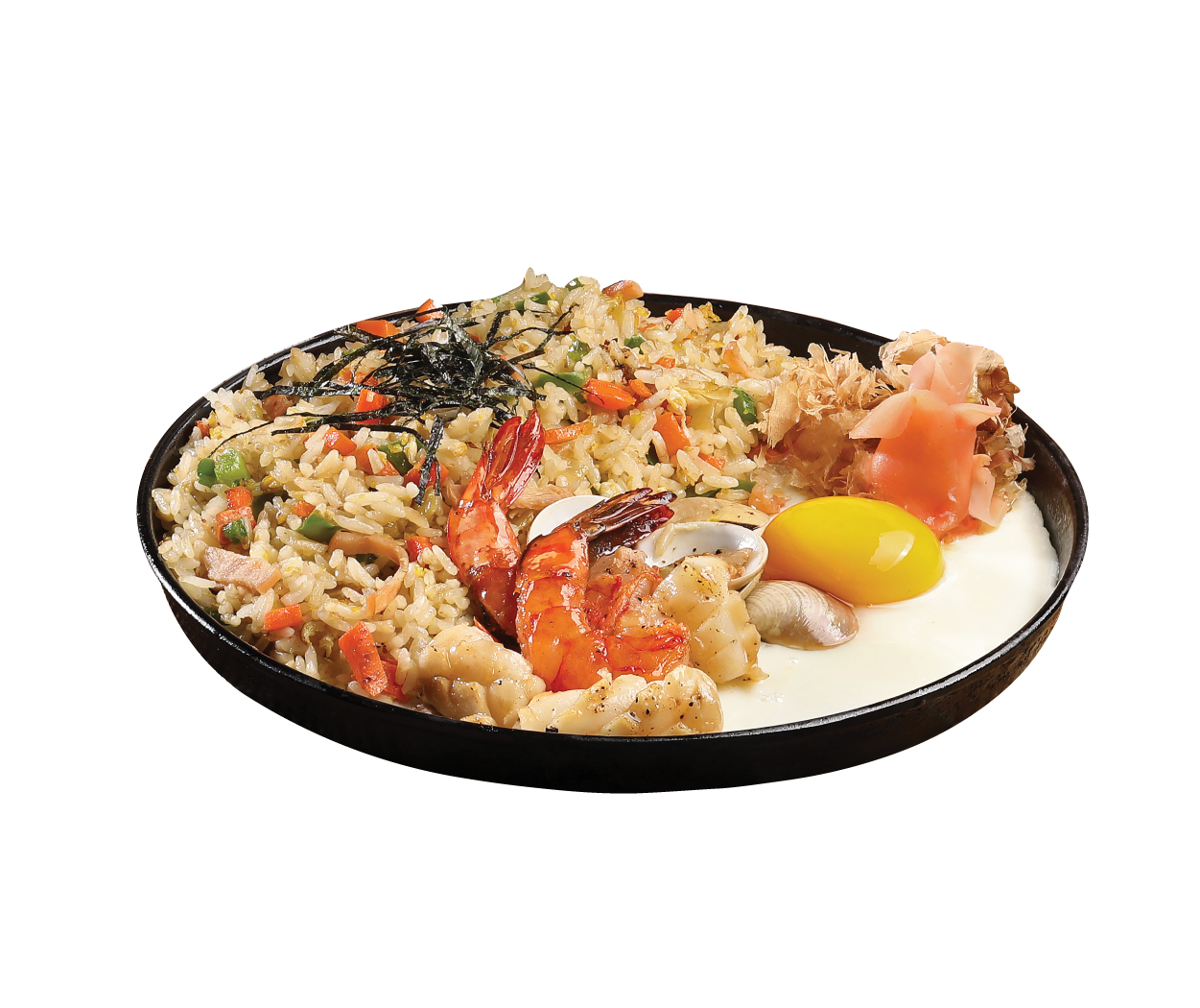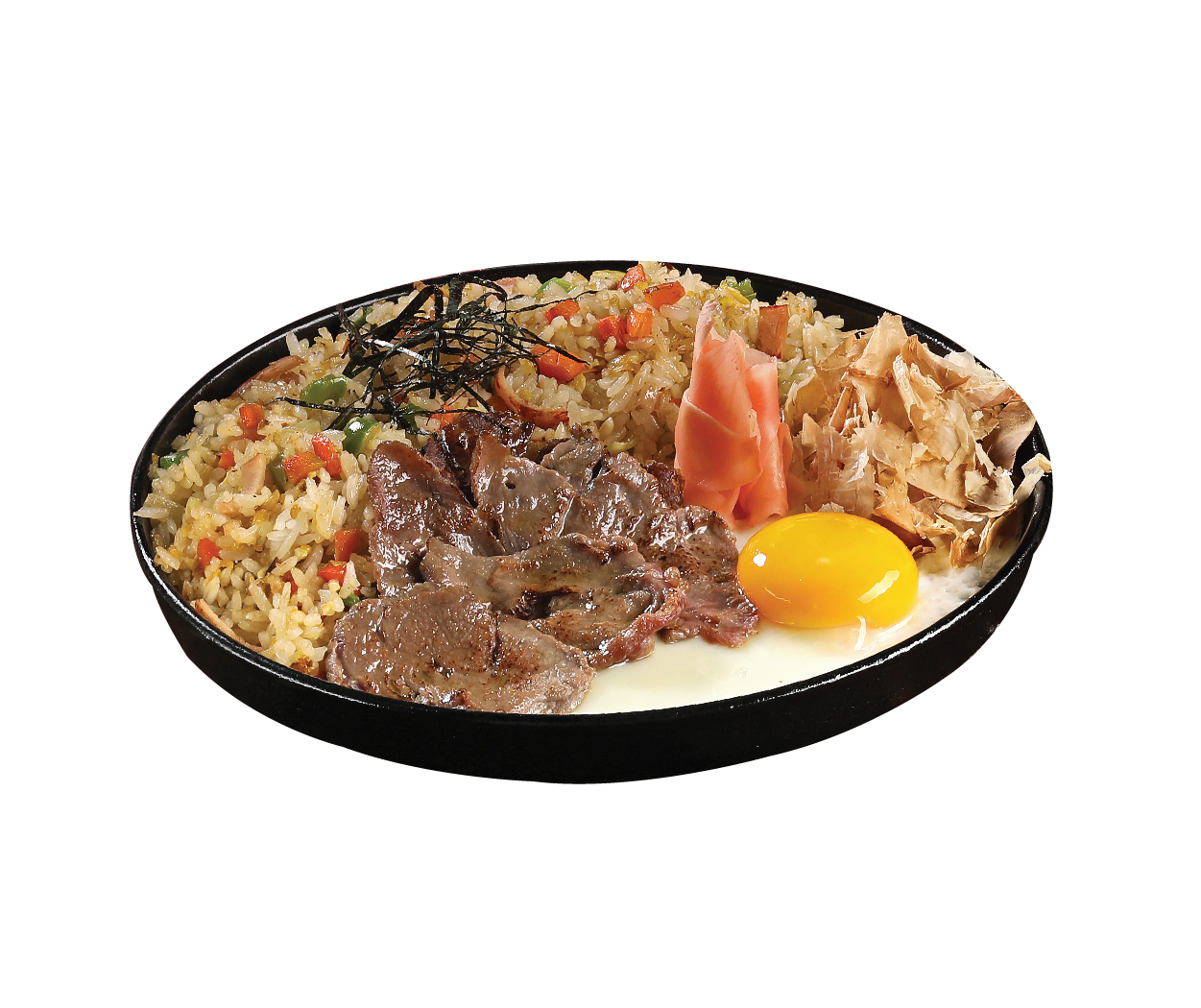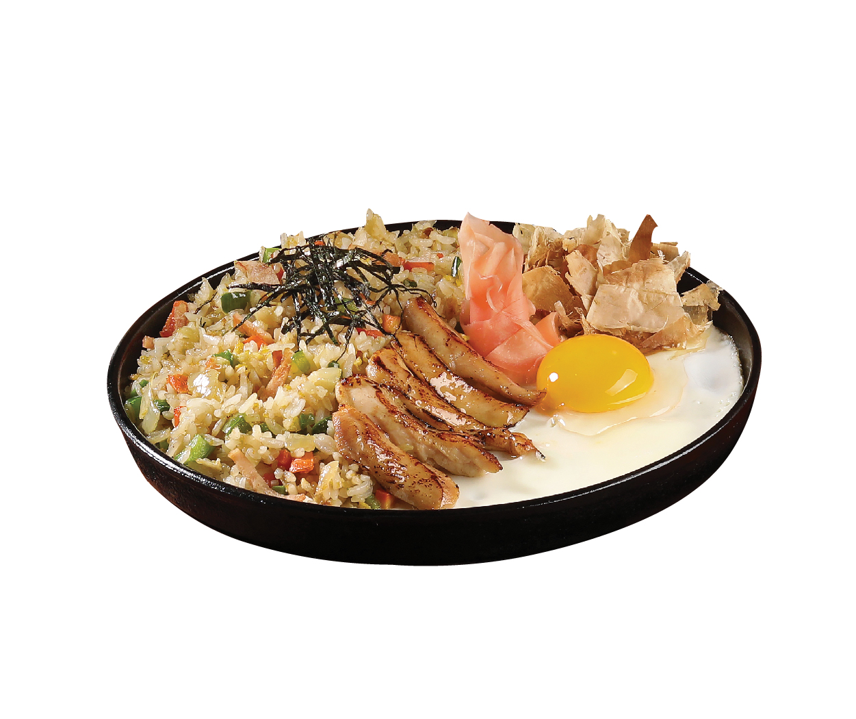 Japanese fried rice mixed chicken and vegies, salad on the side served with katsubushi and nori on top.